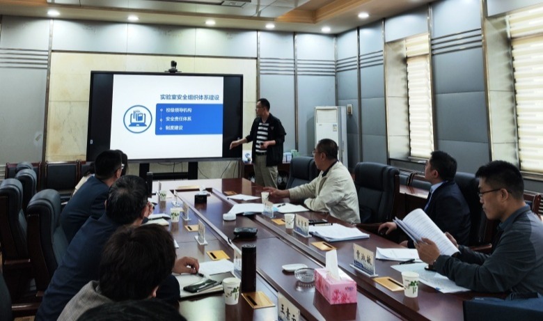 汇报会上,宋学平传达了2023年省教育厅关于高校实验室安全检查工作的相关要求。学校实验室与设备管理中心负责人从实验室安全组织体系建设、实验室安全教育、实验室安全检查与隐患整改、实验室安全专项工作、存在问题与思考等六个方面向专家组进行了汇报。同时,专家组对照《高等学校实验室安全检查项目表(2023)》查阅了学校实验室安全管理制度、安全教育与培训记录、定期各实验室自查自纠报告与整改报告、危险源管理等资料。