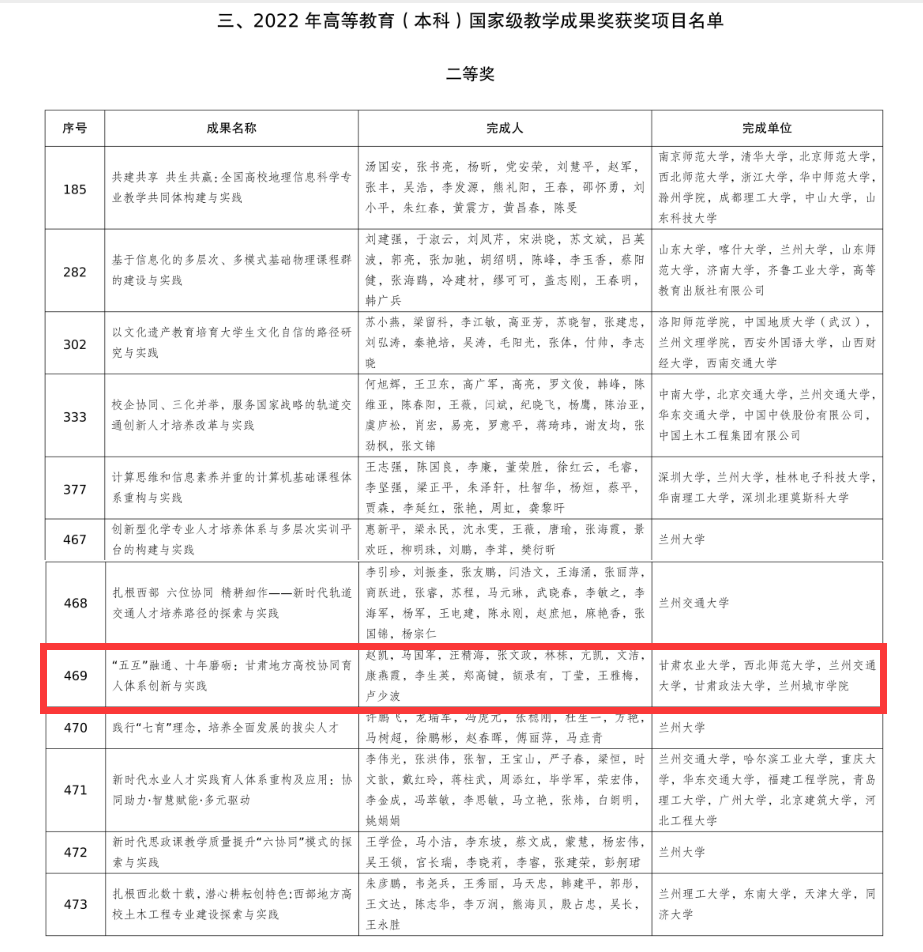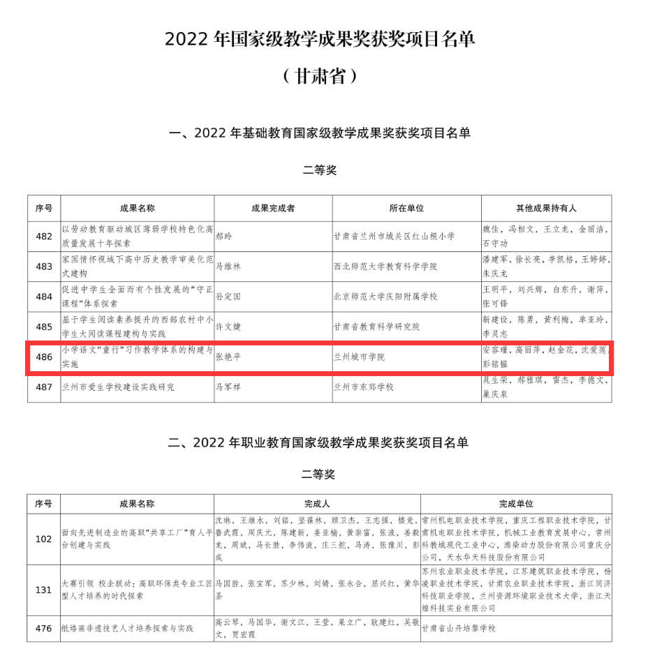 日前,教育部公布了2022年国家级教学成果奖获奖项目名单,伟德教育学院张艳平团队申报的《小学语文“童行”习作教学体系的建构与实施》以第一完成单位获得2022年基础教育国家级教学成果二等奖,教务处李生英教授参与的项目《“五互”联通、十年磨砺:甘肃地方高校协同育人体系创新与实践体系》获得2022年高等教育(本科)国家级教学成果奖二等奖。