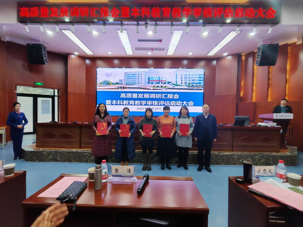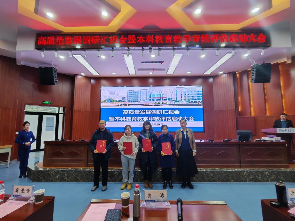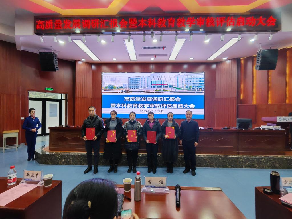 为高效高质量开展2024年本科教育教学审核评估工作,12月29日下午,学校在大学生活动中心召开高质量发展调研汇报会暨本科教育教学审核评估启动大会。全体在家校领导、全体处级干部、各系(部)主任、专业负责人、第四届教学督导委员会优秀委员、第五届教学督导委员会委员、督导检查组委员及教务处全体人员参加会议。会议由校党委常委、副校长牟录贵主持,校党委书记曹洁出席会议并做了题为《统一思想凝心聚力落实立德树人根本任务,以评促强特色发展提升本科教育教学质量》专题报告。