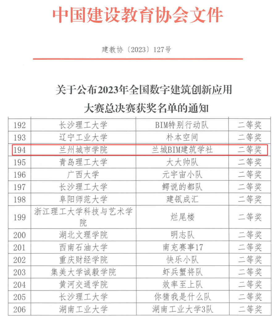 近日,中国建设教育协会公布了“2023 年全国数字建筑创新应用大赛”获奖名单,伟德城市建设学院学生张鑫、杨亚雄、王鹏组成的参赛队伍获得BIM数维设计建模竞赛(本科组)赛项全国二等奖,杨文娟、吴静怡两名教师获优秀指导教师奖。本次比赛共有全国300余所院校的700多个代表队参赛。