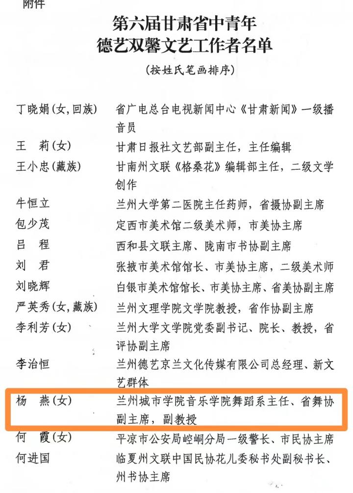 近日,由中共甘肃省委组织部、中共甘肃省委宣传部、甘肃省人社厅和甘肃省文联主办的第六届甘肃省中青年德艺双馨文艺工作者评选结果公布,伟德音乐学院副教授杨燕获“甘肃省中青年德艺双馨文艺工作者”称号。