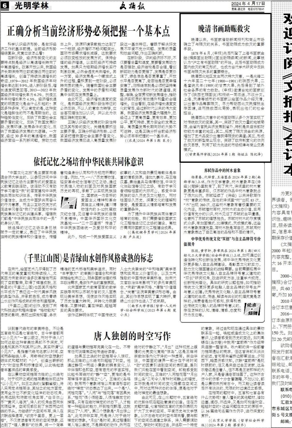 4月17日,《甘肃高师学报》2024年1期见刊的《晚清西北灾害中的书画助赈》一文,被《文摘报》摘录。该文章依托国家社科基金重大项目“近代西北灾荒文献整理与研究”(16ZDA134)、甘肃省高等学校创新基金项目“清代甘肃灾害治理的历史启示”(2022A-077),是以上项目的阶段性研究成果。