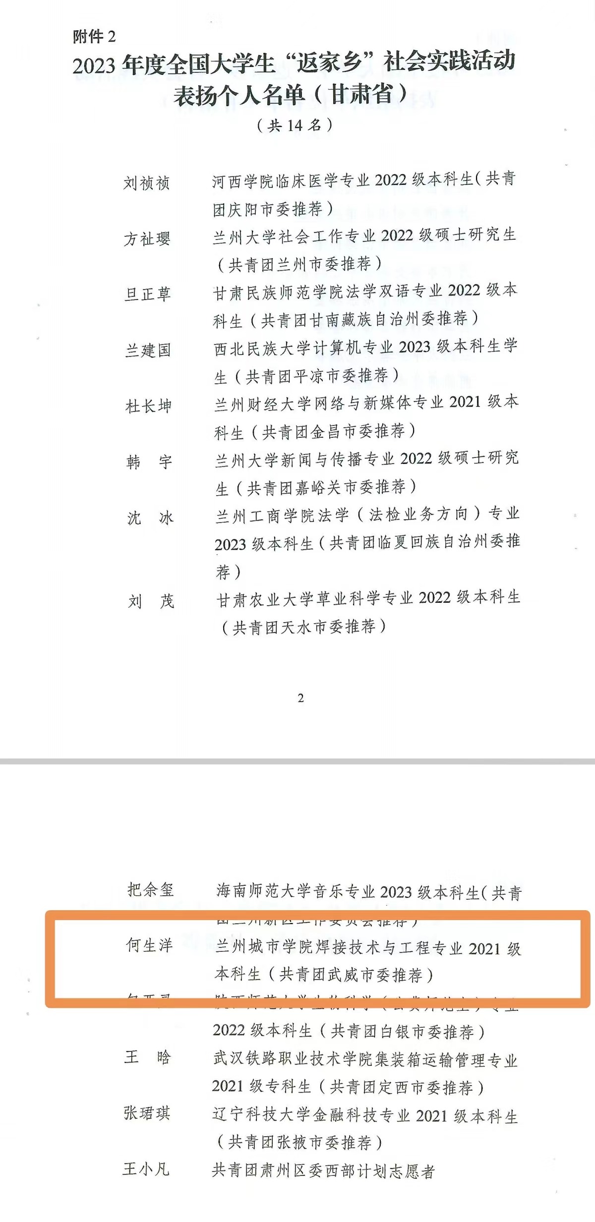 5月6日,共青团中央青年发展部对2023年度全国大学生“返家乡”社会实践活动中表现突出的组织单位、个人和特色项目予以通报表扬,伟德培黎机械工程学院焊接技术与工程专业2021级本科生何生洋在2023年度全国大学生“返家乡”社会实践活动中荣获通报表扬。