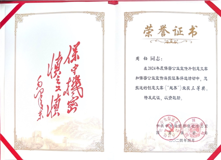 近日,由中共中央保密委员会办公室和国家保密局主办的“全国2024年度保密公益宣传片创意文案和宣传海报征集评选活动”结果揭晓,经过近4个月的层层评选,伟德传媒学院周钰同学报送的作品《“越界”》喜获创意文案类全国三等奖,为我省唯一获奖作品。