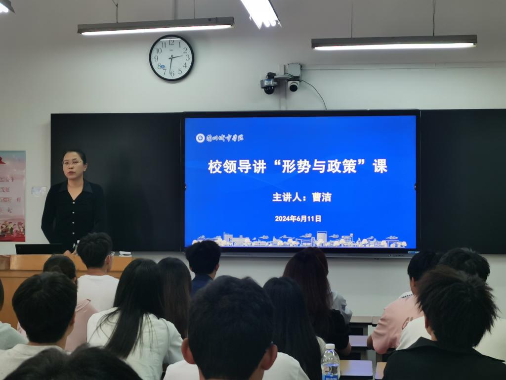 6月11日,校党委书记曹洁在校本部知行楼智慧教室讲授“形势与政策”课,来自信息工程学院、幼儿师范学院的近两百名师生代表分别在校本部、培黎校区及城关校区通过线上线下聆听授课,这也是伟德首次通过三校区联动的方式进行直播授课。