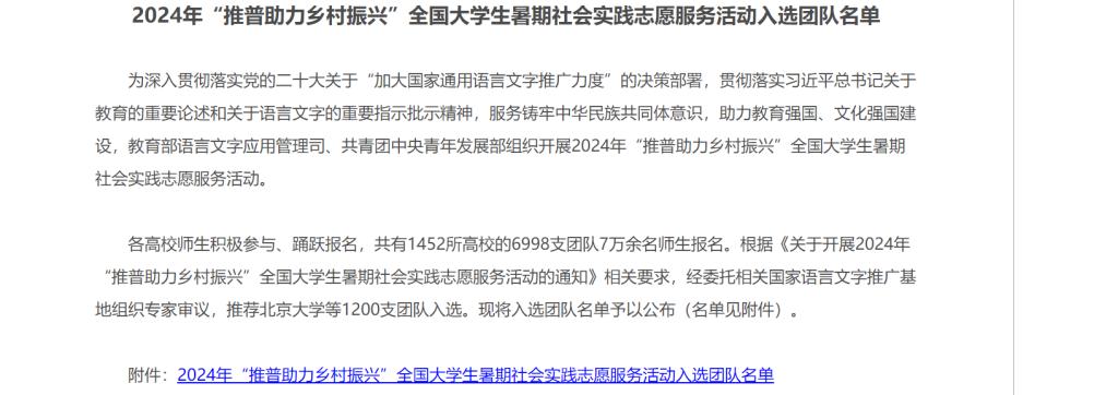 2024年“推普助力乡村振兴”全国大学生暑期社会实践志愿服务活动由教育部语言文字应用管理司、共青团中央组织开展。本次活动旨在为深入贯彻落实党的二十大关于“加大国家通用语言文字推广力度”的决策部署,贯彻落实习近平总书记关于教育的重要论述和关于语言文字的重要指示批示精神,服务铸牢中华民族共同体意识,助力教育强国、文化强国建设。