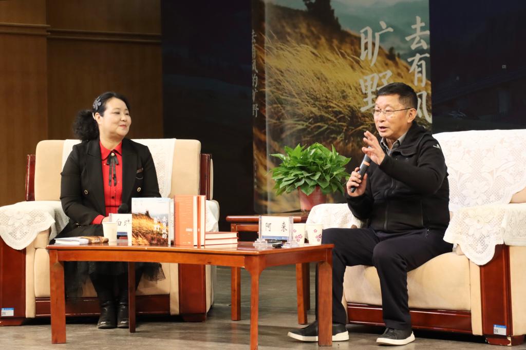见面会由文学院教授、硕士研究生导师白晓霞主持,白晓霞围绕“文学与自然”与阿来展开深入探讨。阿来以《去有风的旷野》一书中的十个行走往事为例,深刻阐述了对自然的深厚情感以及对生命的尊重,探讨了文学与生命、成长的关系。阿来说,他的生活、写作都与自然的一草一木有关,他的文学世界始终充满自然情志,只有深入理解世界,真实感受生命,与世界建立更广阔更丰富的联系,才能在书本和行走之间获得感悟与成长。阿来与现场观众分享了自己的读书心得和写作过程中积累的宝贵经验,他勉励师生们要多读经典著作,丰富阅读体验,构建自己的阅读体系,丰富自己的表达能力,不断提升写作水平和文学素养,坚持知行合一,脚踏实地、实事求是,用实际行动去丈量祖国大地,丰富人生厚度。