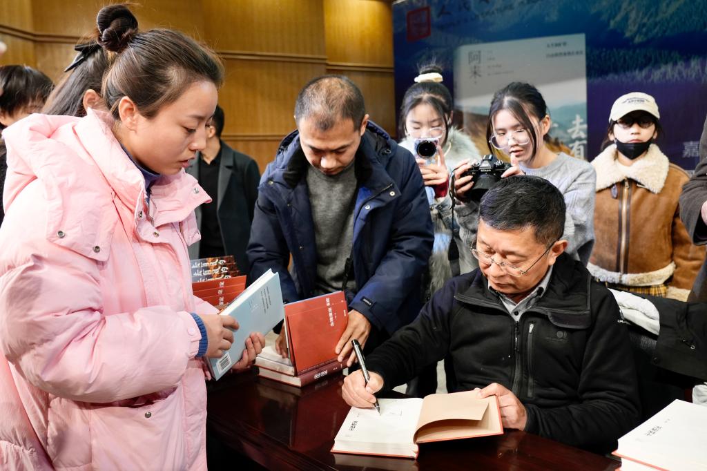 活动现场,师生们踊跃举手提问,阿来围绕经典阅读、文学创作、灵感来源、人文教育等话题,结合个人创作经历一一解答,气氛十分热烈。在签名互动环节,师生们纷纷上台与阿来近距离交流对话、合影留念,阿来也在书页上留下了对同学们的祝福。