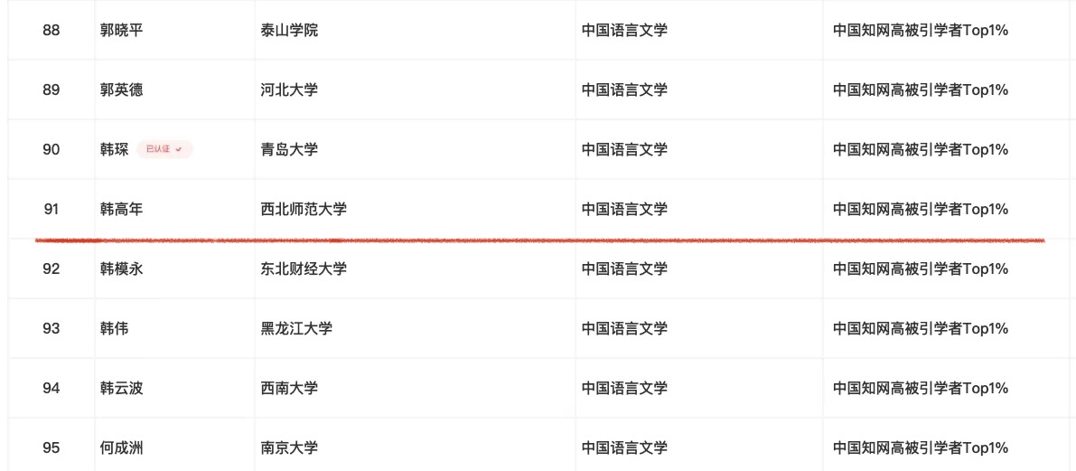 近日,“2024中国知网高被引学者”遴选活动结果正式揭晓,伟德韩高年教授凭借其在“中国语言文学”领域的卓越贡献和广泛影响力,成功入选该领域的高被引学者TOP1%名单。