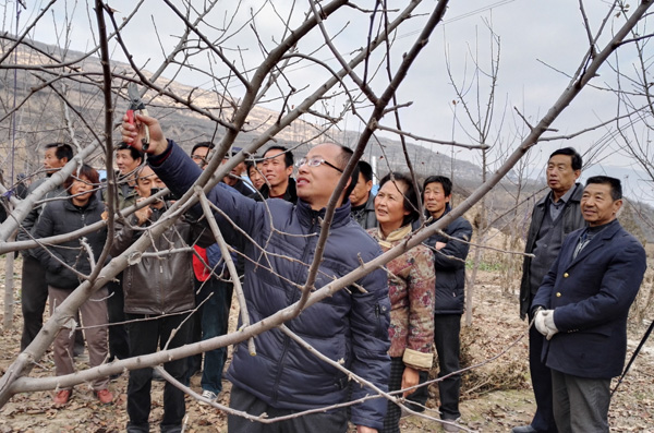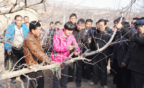 讲座中,专家们针对果农提出的问题,对蚜虫、红蜘蛛病等年周期病虫害防控做了一一阐述。同时,针对果树常见的腐烂病,分析了该病的根源,指出了该病的农业、化学和物理防治措施。随后,专家们进入果园,针对苹果树冬季修剪中树形的选择与培养,主枝、侧枝、枝组的安排与培养,短截、疏枝、回缩、缓放等修剪技术进行了讲解。同时,对幼龄树强壮中干,培养螺旋上升,调整枝干比作了示范;对初果期富士树单轴延伸,枝干同龄重新培育调整出枝干比的技术做了示范指导;对盛果期富士树的整形修剪,叶状结果枝的修剪做了成形指导。