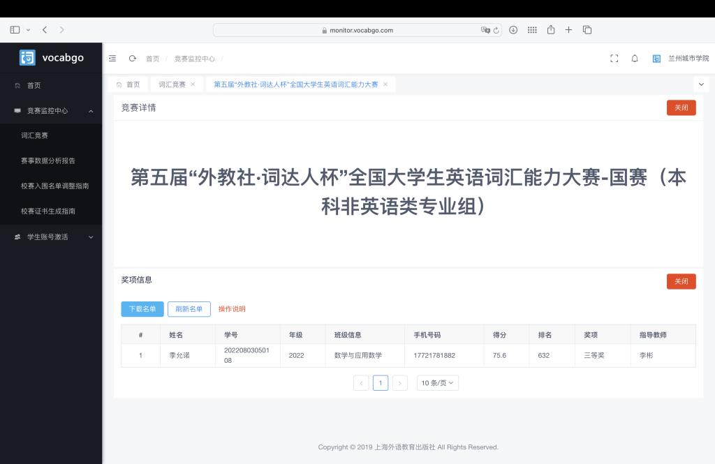 在第五届“外教社·词达人杯”全国大学生英语词汇能力大赛国赛中,据大赛组委会与词达人平台6月4日公布的成绩及获奖信息,季允诺同学获国家三等奖。