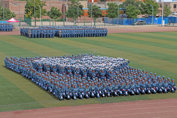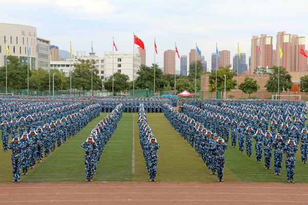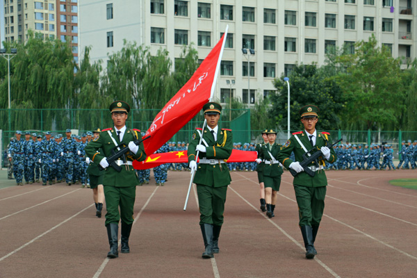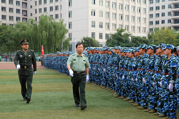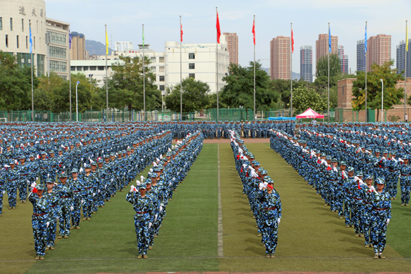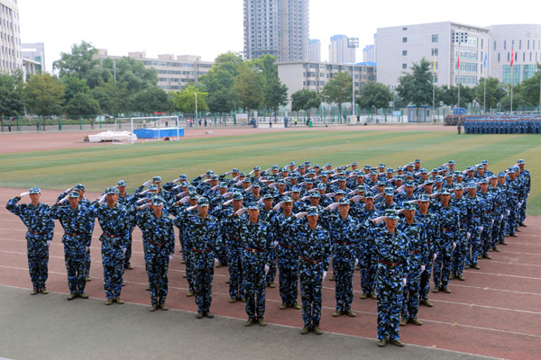 校长王汝锋在军训团团长张志伟的陪同下逐一检阅了由3400名学生组成的28个方阵,向所有参训学员致以诚挚的问候。参训学员英姿飒爽、队列整齐、口号洪亮,以最良好的精神风貌接受了检阅。