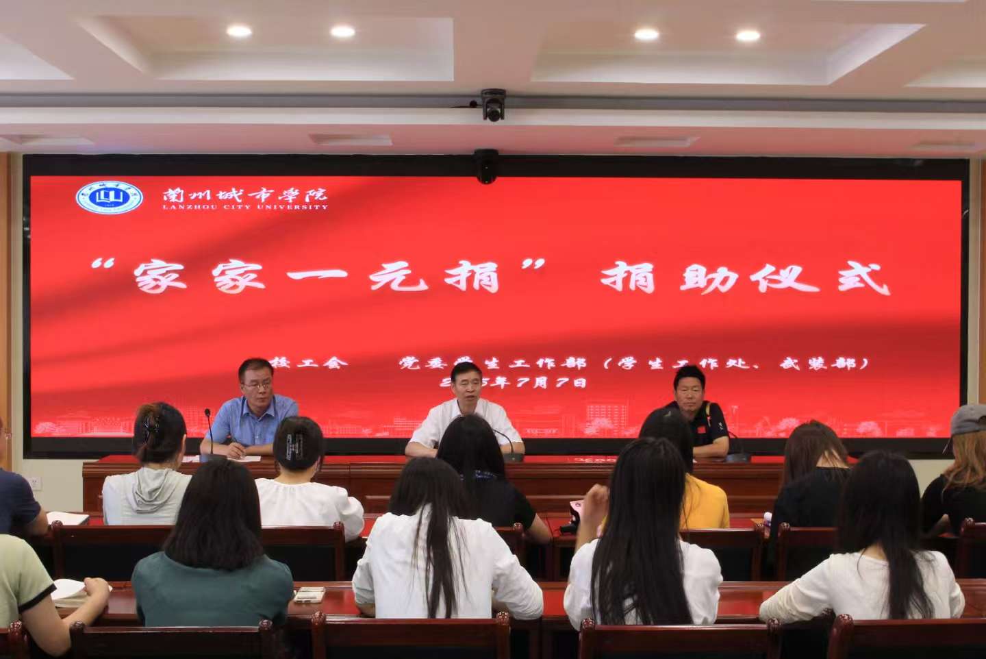 为进一步做好家庭经济困难女学生帮扶工作,妥善解决好工会存量资金、做好困难师生捐助工作。7月7日,在甘肃省、兰州市、安宁区等三级妇联的指导和大力支持下,学校举行“家家幸福一元捐”公益活动捐助仪式,将爱心捐款在暑假前送到家庭经济困难女学生手中。校党委副书记牟录贵出席捐助仪式并讲话。
