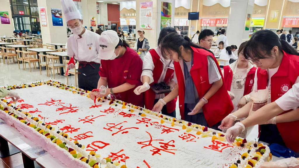 上午,各校区食堂提前准备好蛋糕制作食材,餐饮公司专业人员现场指导学生为教师制作节日蛋糕。同学们将精心装饰的蛋糕赠送给前来就餐的教职工,表达对老师们辛勤工作的感激之情。活动现场气氛温馨,教师们欣然接受这份特殊的节日礼物,共同分享节日的甜蜜与喜悦。