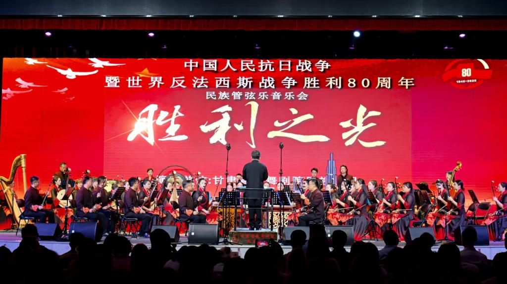 随后,甘肃省歌舞剧院民族管弦音乐会《胜利之光》精彩上演。作品通过《悬刃之境》《故园长明》《星火同天》《月照丰碑》《胜利之光》5个乐章,以丰富的音乐语言和艺术表现手法,再现了中国人民14年抗战的艰苦卓绝与英勇不屈。艺术家们以精湛的演奏技艺和饱满的艺术激情,为师生呈现了一场震撼心灵的艺术盛宴,让师生在艺术的熏陶中深刻感悟抗战精神的力量。