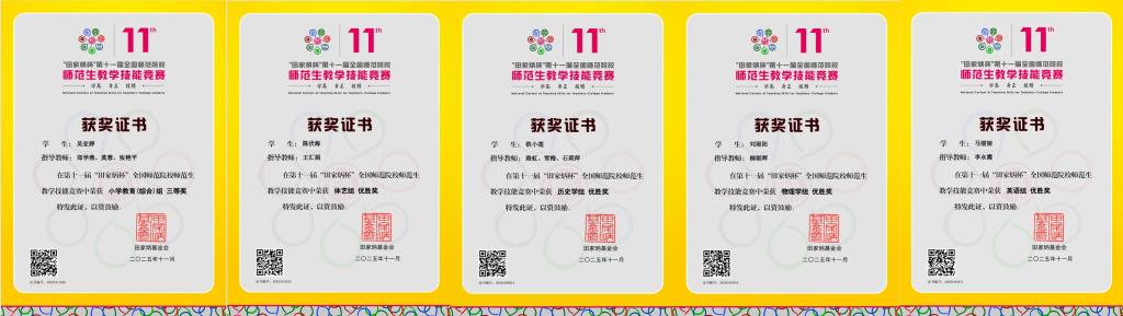其中,教育学院学生吴亚婷凭借出色发挥,荣获“小学教育(综合)组”三等奖。音乐学院陈伏海、文史学院铁小莲、电子与信息工程学院刘雨阳、外国语学院马丽娅四位同学获得优胜奖。