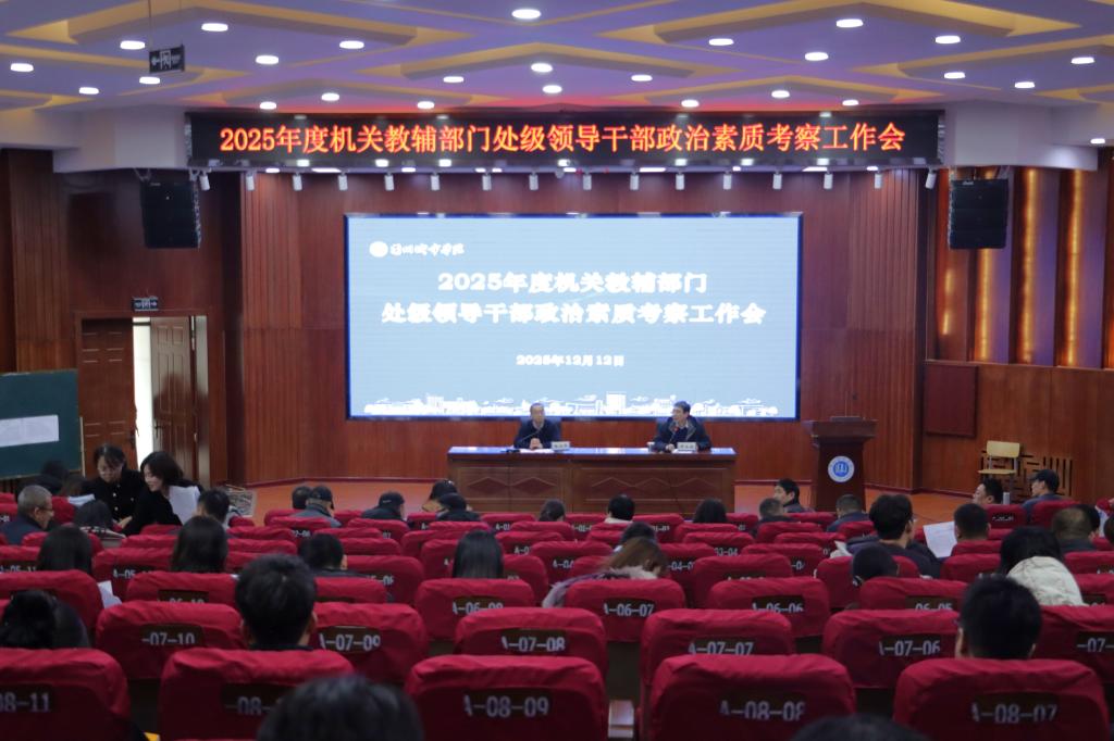 1212日下午,2025年度机关教辅部门处科级干部年终考核测评会、处级领导干部政治素质考察工作会及机关党委党支部书记抓党建述职评议考核工作会在校本部大学生活动中心一楼召开。校党委副书记牟录贵出席会议,机关教辅各部门及机关党委全体党员参加会议