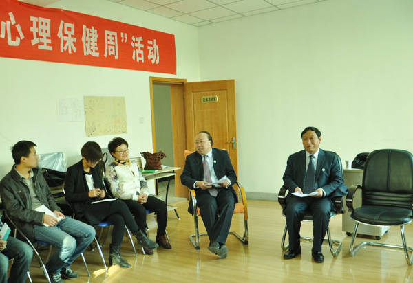 随后,校心理健康教育与心理危机预防工作领导小组在培黎校区心理咨询辅导室召开了心理健康教育工作座谈会。王汝锋在会上肯定了心理咨询与辅导中心的建设及教育辅导工作。他要求,要进一步贯彻《普通高等学校学生心理健康教育工作基本建设标准(试行)》和《普通高等学校学生心理健康教育课程教学基本要求》,不断加强心理健康教育队伍的培训,逐步建立科学的培训制度;要高度重视新生心理健康测查和针对性心理辅导工作,继续加强思想政治教育与心理健康教育的结合,认真配合省委宣传部“阳光甘肃、全民健心”活动的开展;要进一步促进心理健康教育活动与甘肃省高等学校人文社会科学重点研究基地城市社会心理研究中心科研活动的结合,倡导以学院为单位的心理健康教育特色活动,建立学校心理咨询辅导中心、学生工作办公室、班主任、辅导员、班级心理委员联动机制,促进心理健康教育质量再上新台阶。