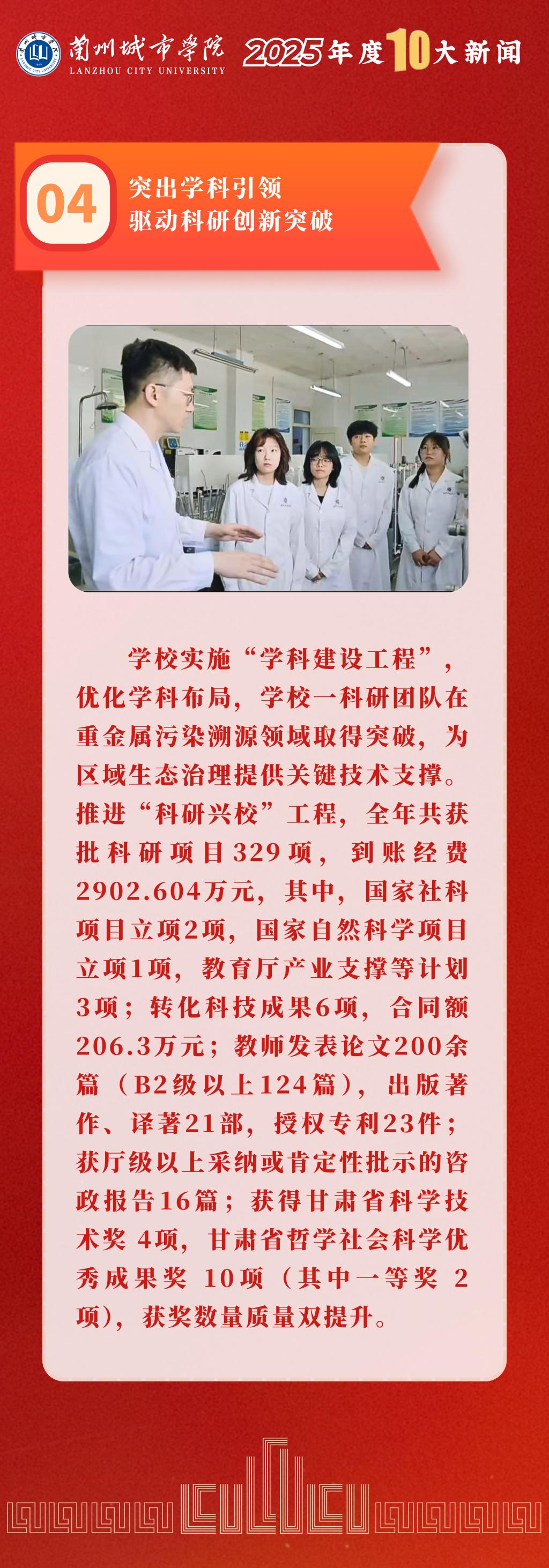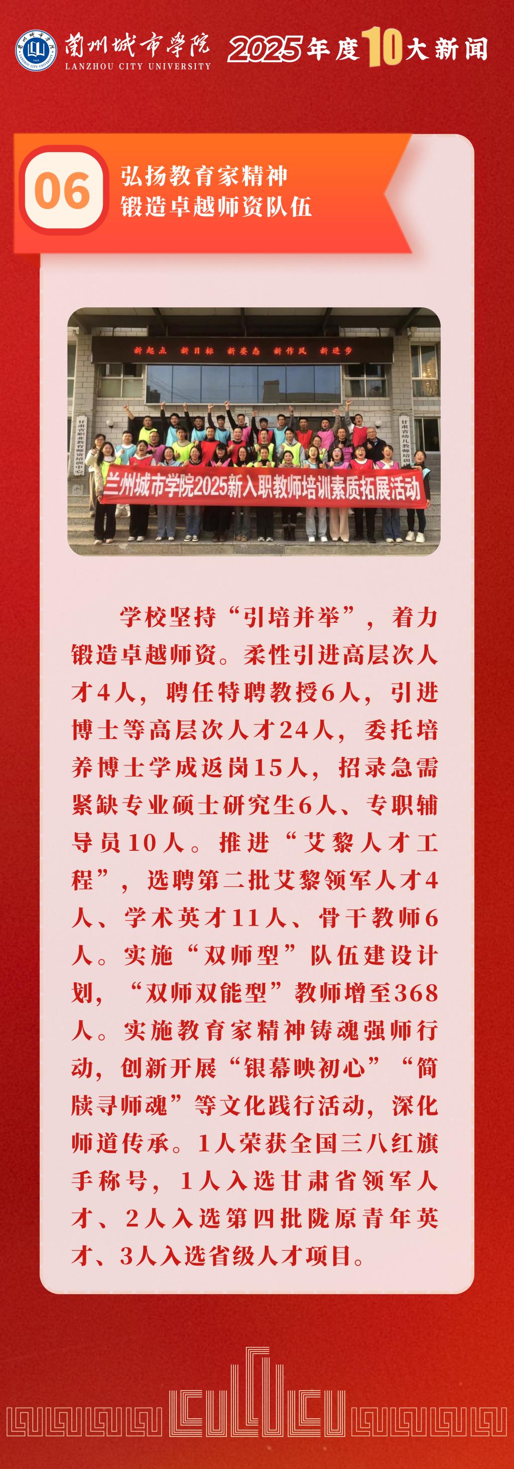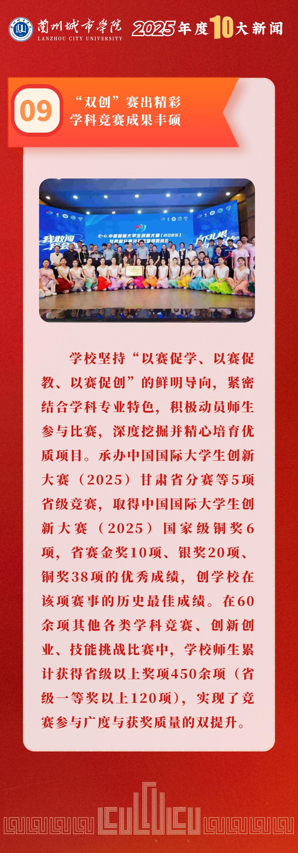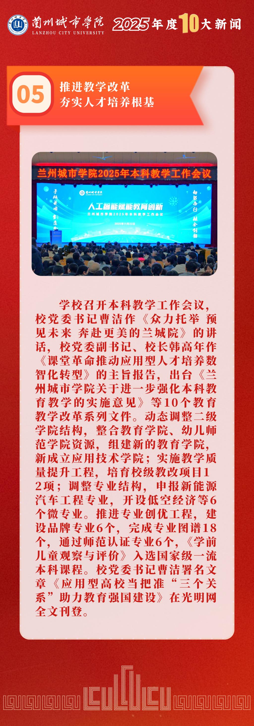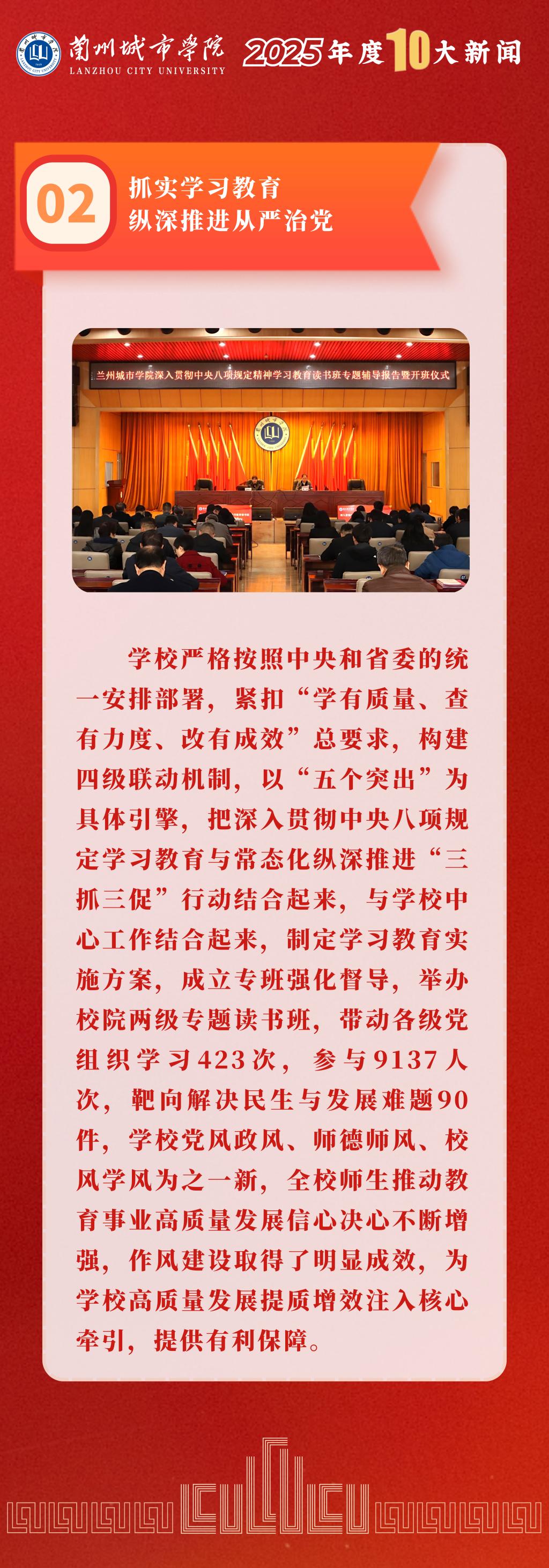 2025年是教育强国、教育强省建设全面布局、高位推进之年,是“十四五”规划收官和“十五五”规划谋划之年,也是学校建设高水平应用型大学,全力推进高质量发展九大工程的攻坚之年。这一年,学校坚持以习近平新时代中国特色社会主义思想为指导,深入学习贯彻落实党的二十大、二十届历次全会精神和习近平总书记视察甘肃重要讲话重要指示精神,扎实开展深入贯彻中央八项规定精神学习教育,全面落实全国全省教育大会和《教育强国建设规划纲要(2024—2035)》精神,主动融入国家发展战略和省委“五强”行动,持续深化“三抓三促”行动,以“高质量、高水平、高速度”发展为统领,系统谋划“十五五”事业发展规划,全面深化综合改革,各项事业均取得了令人振奋的成绩。