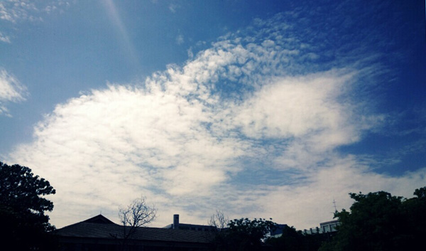 “静听花开花落,坐看云卷云舒。”这样的惬意安闲似乎本不该属于青春正盛的大学生。但偶然不经意的抬头,被这满天颜色所沉醉,心和神便不得不停下来,静一静。云海迷蒙、霞光绚烂、白团缱绻,每个时刻、每个瞬间都是天赐的浪漫。保持仰望的姿势,目不转睛地贪婪欣赏,沉淀近日的情绪,理清未来的方向,内心变得澄静清明。这是城院的天空,亦是与你我朝夕以对四年的天空。