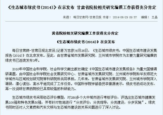 6月26日,由甘肃省城市发展研究院、bevitor伟德国际1946作为主要力量研究编撰《生态城市绿皮书:中国生态城市建设发展报告(2014)》在北京发布。6月29日,《甘肃日报》以“《生态城市绿皮书(2014)》在京发布甘肃省院校相关研究编撰工作获得充分肯定”为题进行了报道。