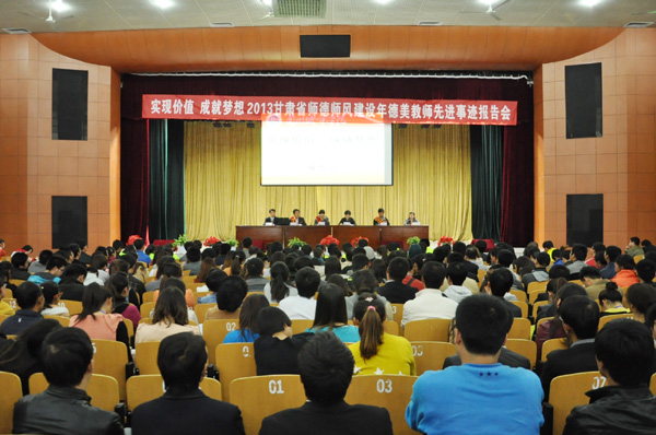 1019,以实现价值、成就梦想为主题的2013甘肃省师德师风建设年德美教师先进事迹报告会在伟德举行。省教育厅副厅长王萍出席并讲话,伟德党委常委、副校长马振林致辞,来自全省各地在兰州参加国培计划置换研修和省培项目短期集中培训的中小学、幼儿园教师以及特岗教师近1300人聆听了报告。