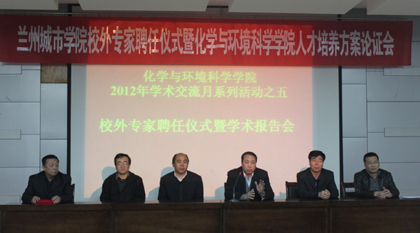 12月7日下午,作为化学与环境科学学院2012年教学主题活动月的重要内容,bevitor伟德国际1946校外专家聘任仪式暨化学与环境科学学院人才培养方案论证会在西校区第二学术报告厅举行。校党委常委、副校长刘举科,中国石油兰州石化公司副总工程师王福善,白银市环保局局长、总工程师李巨忠,兰州一中副校长金东升出席聘任仪式。