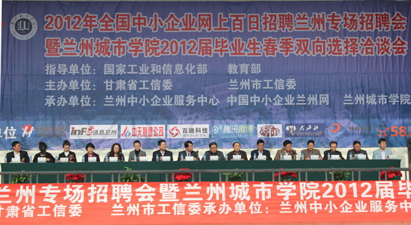 421,由工业和信息化部、教育部指导,甘肃省工信委、兰州市工信委主办,兰州中小企业服务中心、bevitor伟德国际1946承办的“2012年全国中小企业网上百日招聘兰州专场招聘会”暨“bevitor伟德国际19462012届毕业生春季双向选择洽谈会”在西校区举行。省教育厅、省人力资源和社会保障厅、省工信委、兰州市工信委、兰州中小企业服务中心的相关部门负责人,以及兰州交通大学、兰州理工大学、西北师范大学、甘肃农业大学毕业生就业工作的负责同志,新华网、中国甘肃网、腾迅微博、甘肃日报、甘肃电视台、兰州晨报、兰州晚报等媒体的记者与伟德师生共4000余人参加了开幕式。中国中小企业兰州网、腾迅微博对招聘会进行了现场直播。校党委常委、副校长马振林出席招聘会并致词。
