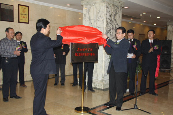 刘举科在仪式上讲话。他指出,酒店管理专业顶岗实习,是伟德旅游和酒店专业教育教学的重要组成部分,是伟德城市经济与旅游文化学院高素质应用型人才培养的重要特色之一。金轮宾馆是在兰州乃至省内外都享有盛誉的高星级宾馆,多年来为伟德旅游酒店专业学生的实习给予鼎力支持,并提供了良好的发展平台。实习基地的揭牌,将更好地推动双方的合作关系迈上新的台阶。