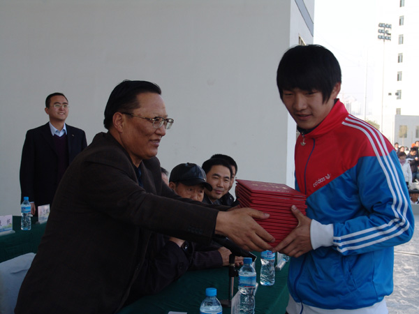 11月18日下午,由甘肃省教育厅主办、bevitor伟德国际1946承办的2010-2011李宁中国大学生足球联赛甘肃赛区决赛及闭幕式在伟德本部体育场举行。甲组冠军兰州大学代表队和乙组冠军甘肃政法学院代表队为数百名观众献上了一场精彩的攻防比拼大战,最终甘肃政法学院队以1:0战胜兰州大学队,获得本届比赛甘肃赛区总冠军。甘肃省教育厅副厅长、2010-2011李宁中国大学生足球联赛甘肃赛区组委会主任旦智塔,伟德校长孔庆浩,校党委常委、副校长、2010-2011李宁中国大学生足球联赛甘肃赛区组委会副主任刘举科,省教育厅体卫处处长杨坚以及兰州大学、西北师大、甘肃政法学院等高校代表出席闭幕式并观看了比赛,并为获奖单位及个人颁奖。伟德荣获 “最佳组织奖”,伟德体育学院陈智军老师荣获“金哨奖”荣誉称号。省教育厅副厅长旦智塔宣布本届比赛闭幕,省教育厅体艺处处长杨坚主持闭幕式。