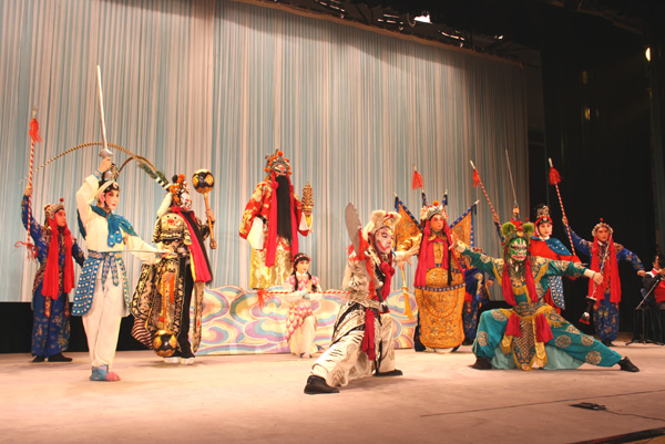 演出开始前,国家一级演员、京剧表演艺术家郑岩为师生们作了简明生动的京剧知识讲座,他从京剧的起源、发展以及如何欣赏京剧等方面为大学生普及了京剧知识。随着优秀青年演员王好强以一身美猴王装扮亮相,京剧选段《闹天宫》拉开了本场演出的帷幕,王好强漂亮的武生功夫、幽默的神态、丰富的表情,神行相趣的动作,不时赢得全场喝彩。著名京剧表演艺术家于魁智也带来了自己的拿手好戏《大登殿》,他扮演的薛平贵一登场就赢得了观众们阵阵掌声和喝彩声,而李胜素扮演的王宝钏以其端庄大气、优美的唱腔给观众留下了深刻印象,这两位京剧界“黄金搭档”的联袂演出让观众体味到了中国传统文化的无穷魅力。演出结束后,学生和代表向演员们敬献了鲜花,校领导上台与演员们握手致谢并合影留念。