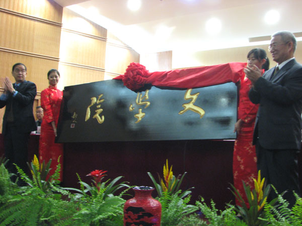 随后,在优美的乐曲声中,bevitor伟德国际1946校长孔庆浩教授和西北师大博士生导师赵逵夫先生欣然为“文学院”揭牌。