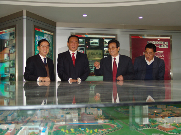 图为石军副省长(左二)在我院王兴隆书记、孔庆浩院长的陪同下参观学校发展规划图
