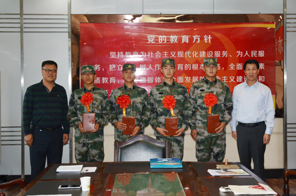 会上,陈晓龙为4名入伍进藏的大学生新兵佩戴了光荣花,并赠送了纪念品。保卫处(武装部)负责人宣读了应征入伍的同学名单,介绍了4名进藏新兵的基本情况。李长江同学代表4名入伍进藏的大学生新兵作了表态发言,表达了他们立志军营,成长成才、报效祖国的决心和意志。