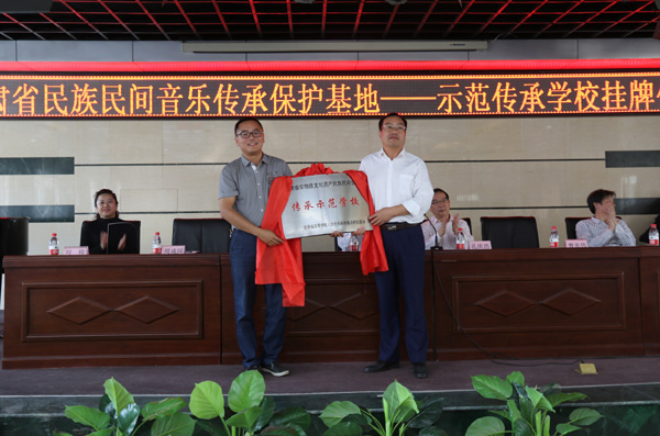 莫超为两所“传承示范学校”授牌,并在仪式结束后,为兰州第十四中副校长徐芸、兰州东郊学校校长朱文龙颁发了bevitor伟德国际1946民族音乐研究中心特约研究员的聘书。