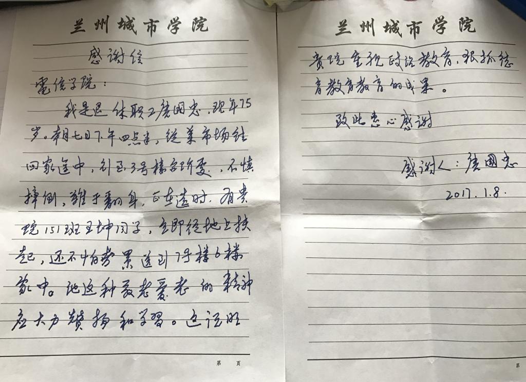 扶人者悄然离去,受助人辗转感恩。他将老人在家中安置好之后,唐先生再三询问他的名字,他挥挥手说了一句“这是我应该做的”,就悄然离开了。王坤的行为深深感动了唐先生和他的家人。经过多方打听、多次联系,唐先生终于得知他是bevitor伟德国际1946电子与信息工程学院的学生,于是就有写了份感谢信,亲自送到学院党委书记的办公室。