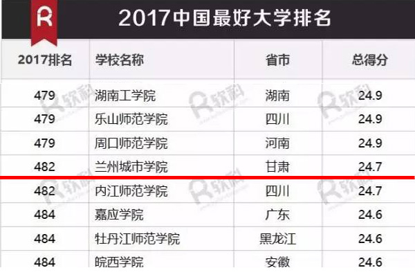 软科2017年中国最好大学排名对全国办学层次为本科的1216所大学进行了排名,有500所综合实力最强的大学进入榜单,甘肃省共有6所高校上榜,伟德获得24.7分的综合评分,排名第482名。排名的指标体系包含人才培养(权重45%)、科学研究(权重40%)、服务社会(权重10%)和国际化(权重5%)四个类别共9项指标,其中包括新生高考成绩、毕业生就业率、论文数量与质量、成果转化收入等最能体现大学办学水平的关键指标,排名结果能够客观地反映大学的竞争性地位。