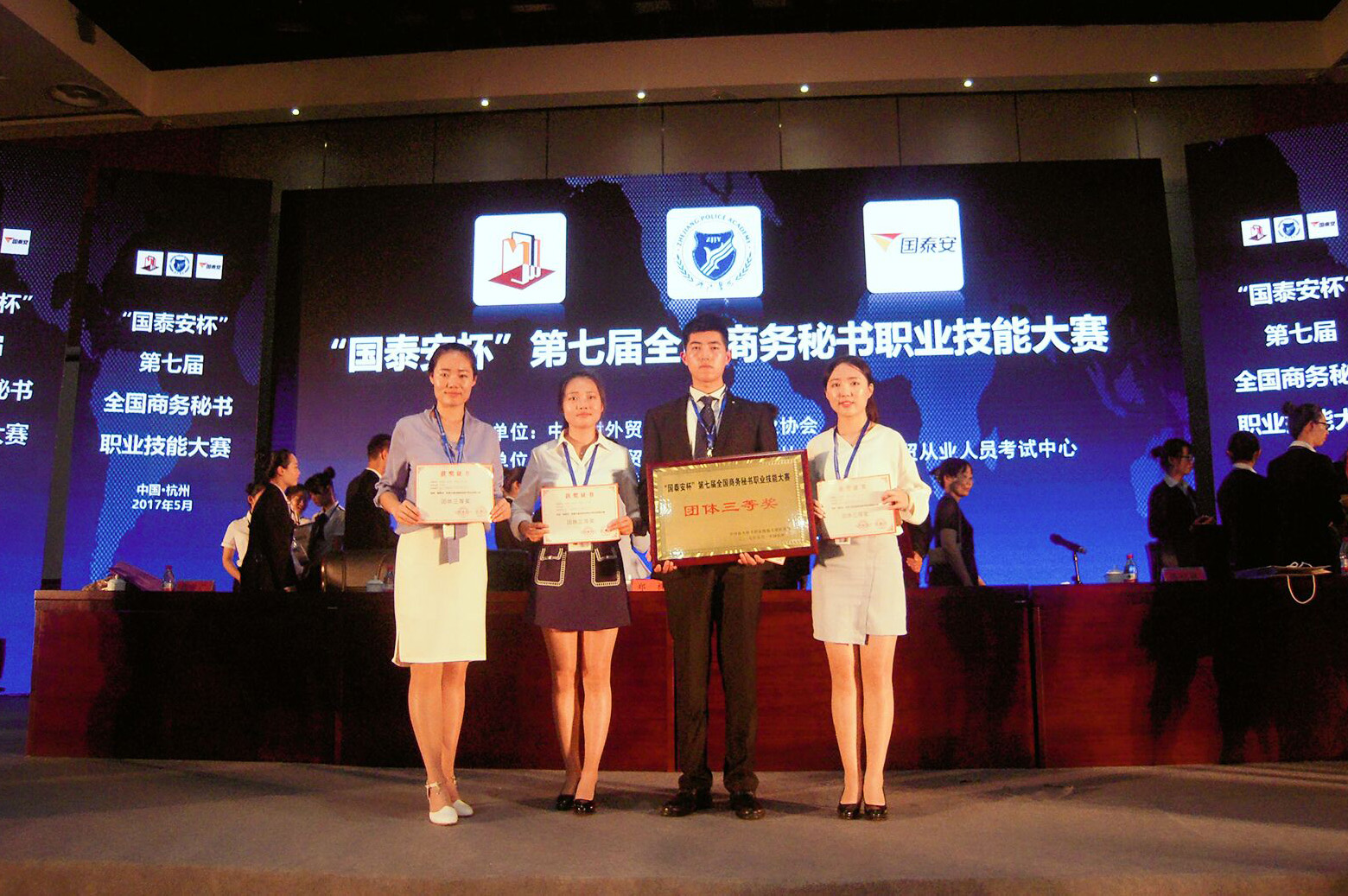 5月26日至28日,“国泰安杯”第七届全国商务秘书职业技能大赛在浙江警官学院举行。伟德文史学院秘书学系2014级学生何鹏、柴露露、李俊佼、张妹玲组成的代表队荣获团体三等奖,其中张妹玲同学荣获个人三等奖。