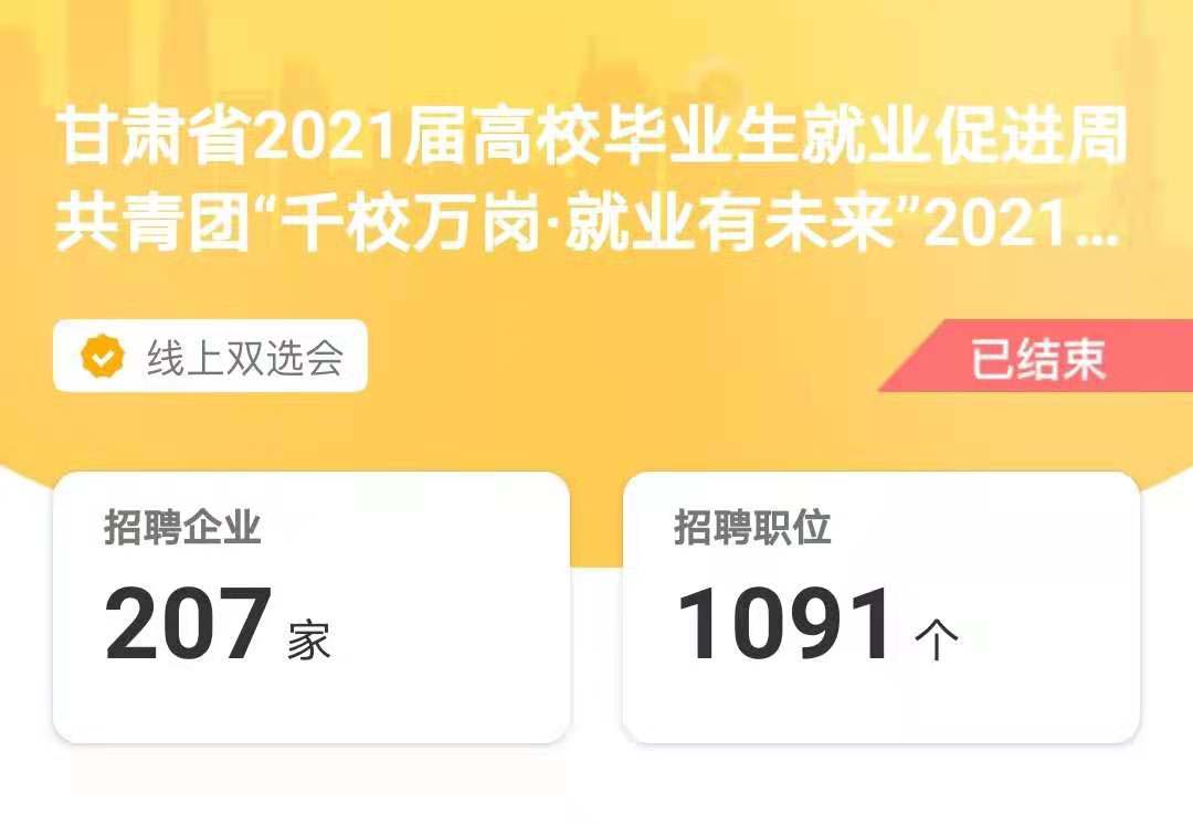 5月23日,学校通过易校招APP,举办了“甘肃省2021届高校毕业生就业促进周 共青团‘千校万岗·就业有未来’2021年夏季网络双选bevitor伟德国际1946专场暨bevitor伟德国际19462021届重点群体毕业生就业帮扶网络双选会”大型校企供需对接大会活动,本次网络双选会有乌什县教育和科学技术局、欧伏电气股份有限公司、凤凰光学股份有限公司、中国石油天然气第七建设有限公司等207家用人单位参会,岗位涉及金融、计算机软件、互联网、能源、医药、教育、文化等多个领域,提供岗位1091个,岗位需求总人数达到21874人。