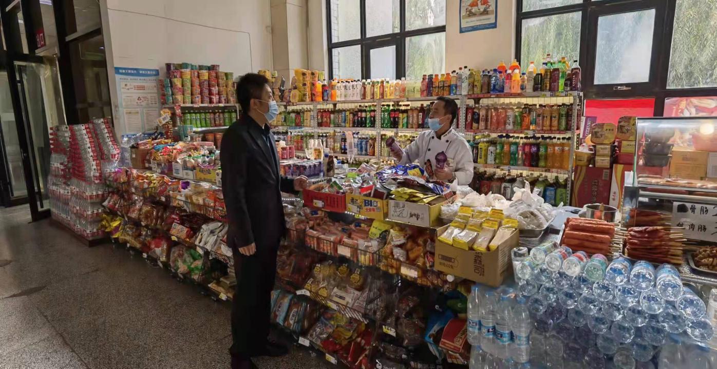 工作人员查看商铺现场环境,运营及货物供需情况,检查疫情防控措施落实、从业人员个人防护情况。要求商户严格按照学校疫情防控要求按时上报健康情况、做好自身防护,尽力确保货物充足、保障食品安全、不随意涨价,为师生做好服务保障工作,倡导商户们为抗击疫情尽一份社会责任。