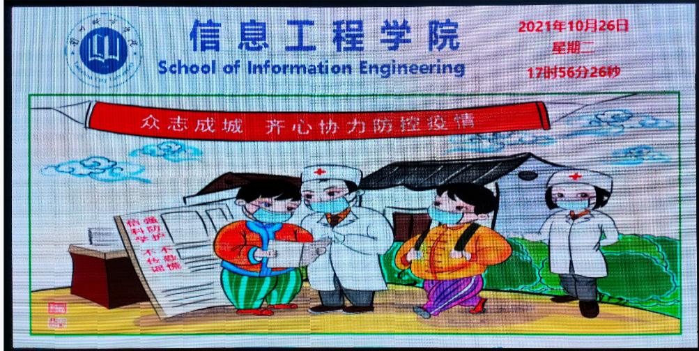 学院充分运用学院网站、LED电子屏幕等多种方式,广泛宣传普及新冠肺炎呼吸道传染病防控知识,不断提高师生防控水平和自我防护能力,构筑群防群治的严密防线。2021年10月20日,通过学院主页启动了疫情防控的专题logo “众志成城,防控疫情”“live a healthy life day”,要求全体师生“抗击新冠病毒,从你我他坐起”“勤洗手,不乱跑,戴口罩,常通风”;利用教学楼内LED电子屏幕以视频和图片等形式宣传防疫政策和知识点,全面、直观地让师生看得着、听得懂、做得到的防疫知识,引导师生配合群防群治工作,用科学力巩固防控信心。