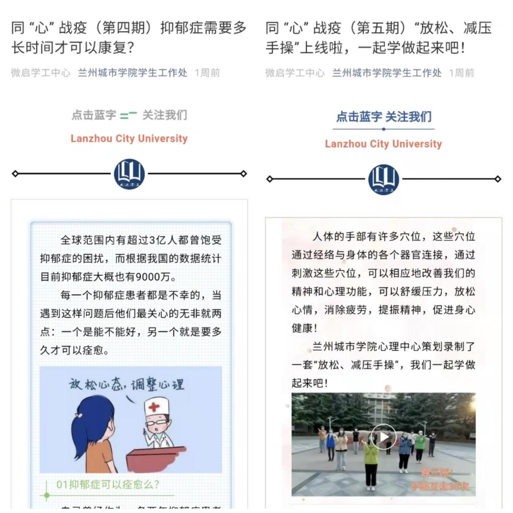 学生工作处及时了解学生的思想生活情况,关注学生心理状态,注重加强学生心理健康教育,为学生提供切实有效的帮助和指导。11月6日至9日,学生工作处以保障学生身心健康为重点,邀请专家分别在三个校区开展线上心理健康讲座、线上心理委员专题报告,尤其为全校46名隔离(留观)学生开展线上团体心理辅导,帮助学生提升自我心理能量,增强心理“免疫”,以理性平和的心态应对疫情,共同筑建心理防线。同时,心理健康教育与咨询中心还开通了疫情期间的心理健康咨询渠道,24小时心理健康服务热线和阳光网络心理辅导,并加大心理健康宣传力度,推送“防疫心灵小贴士”,以图文并茂、喜闻乐见的方式为全校学生提供实时有效的心理援助服务和医学科普。
