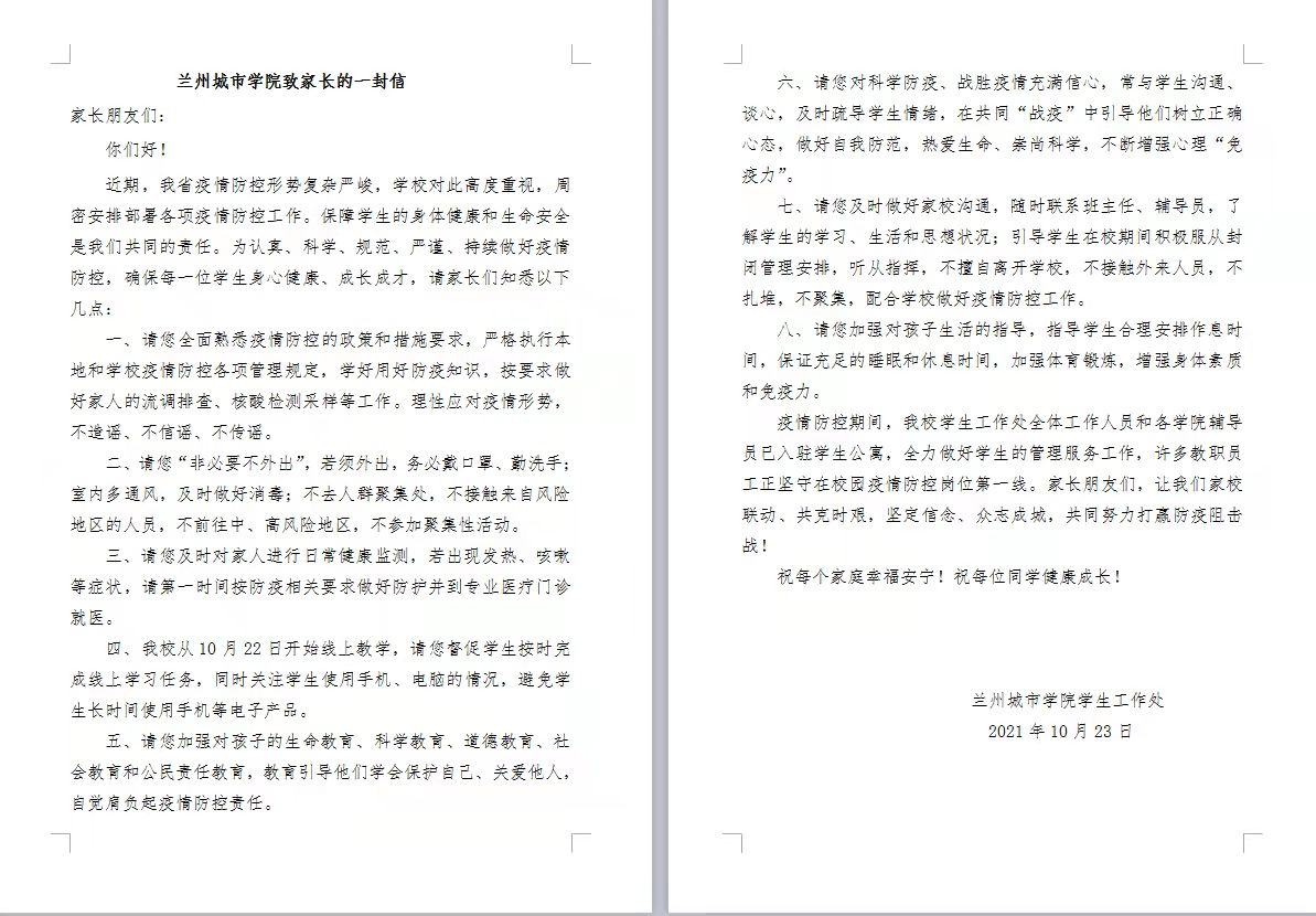 为认真、科学、规范、严谨、持续做好疫情防控,为减轻全体同学的恐慌焦虑等不良情绪,确保广大学生的身体健康和生命安全,学生工作处立即下发了《致学生家长的一封信》,呼吁家校连心、共克时艰,坚定信念、众志成城,共同努力打赢防疫阻击战。