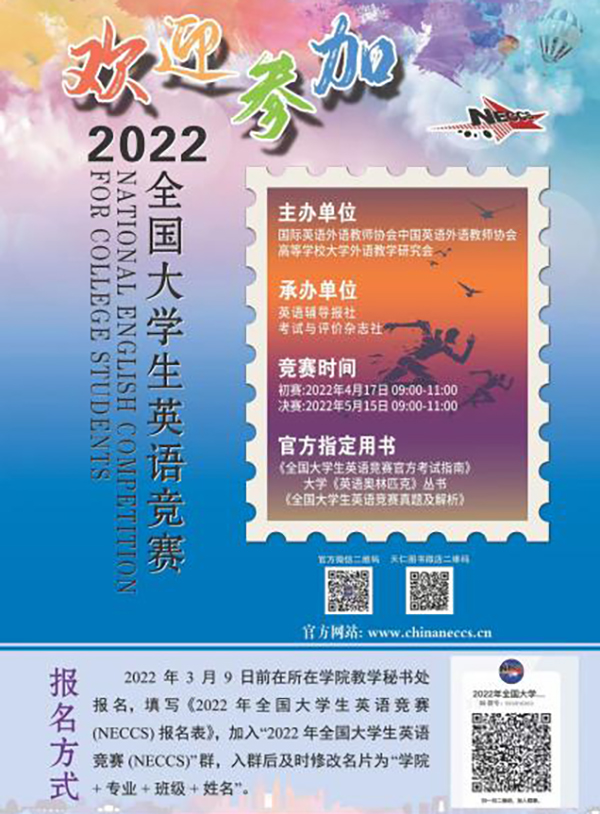 以赛促学抓学风,学科竞赛展雄风。学院坚持“以赛促学”,积极组织2022年全国大学生英语竞赛(NECCS)和第二届“外教社·词达人杯”全国大学生英语词汇能力大赛报名工作。两项竞赛报名人数分别达到了379人和2099人,居省内同类院校前列;组织全体教师线上参加外研社外举办的“第六届全国高等学校外语教育改革与发展高端论坛”和外教社举办的“共建高质量发展的外语教学新生态——第十一届全国大学英语院长/系主任高级论坛”,了解外语学科的最新发展动态和教学改革趋势;积极筹备第五届“外教社杯”全国高校学生跨文化能力大赛校赛(初赛),反复研讨论证校赛方案,力争成绩实现跨越性突破。