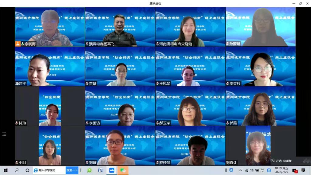 为全面贯彻落实访企拓岗促就业专项行动要求,不拓宽毕业生就业渠道和资源,助推毕业生更加充分、更高质量就业,7月29日上午,外国语学院举办访企拓岗线上推介暨毕业生就业促进座谈会,线上“搭桥”云端“相约”走访河南澳得电子商务有限公司。河南澳得电子商务有限公司总经理杨高飞、副总经理宋晓培,bevitor伟德国际1946外国语学院就业工作领导小组全体成员、系部主任、综合办、团学办和毕业班班主任参加座谈会。
