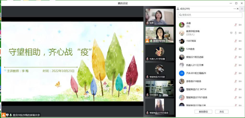 学校心理健康教育与辅导中心9位专兼职教师为18个二级学院开展了15场题为《守望相助,齐心战疫》的线上团体心理辅导活动,参加人数累计5000余人。针对疫情防控期间学生可能会出现的情绪、睡眠、自我心理建设和人际交往等方面,分析了疫情期间大学生常见的心理问题,并从情绪角度、疫情影响及影响背后的心理机制、如何应对压力等角度出发,多层次、多方位讲授了呵护心理健康的重要性及必要性,为同学们提供了切实可行的调节方法。