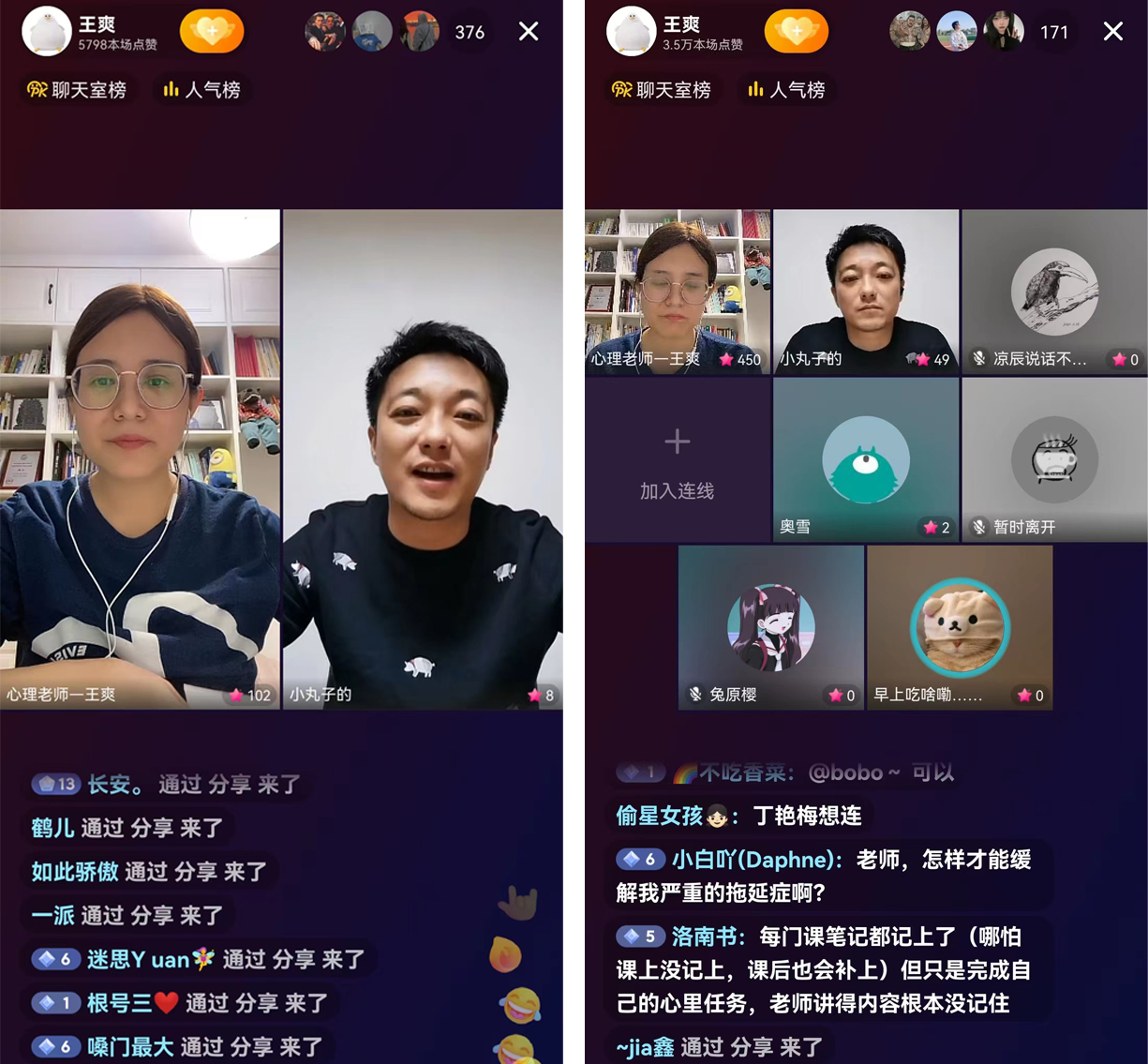 甘肃政法大学副教授王爽、西北师范大学姜副教授姜艳斐、兰铁一中专职心理健康教师张翔,3位心理学专业老师强强联合,利用抖音直播形式开展了3场心理辅导活动。活动中,老师们本着和学生平等交流的原则,引导学生踊跃发言、积极互动,鼓励同学们要善于表达内心感受,说出自己的困难,学会正向思维的妙用,培养持之以恒的爱好。老师们和同学们就失眠、恋爱、学业、亲子关系等问题展开热烈讨论。直播间在线观众累计多达8000余人,连线人数100余人,点赞量高达10万次。