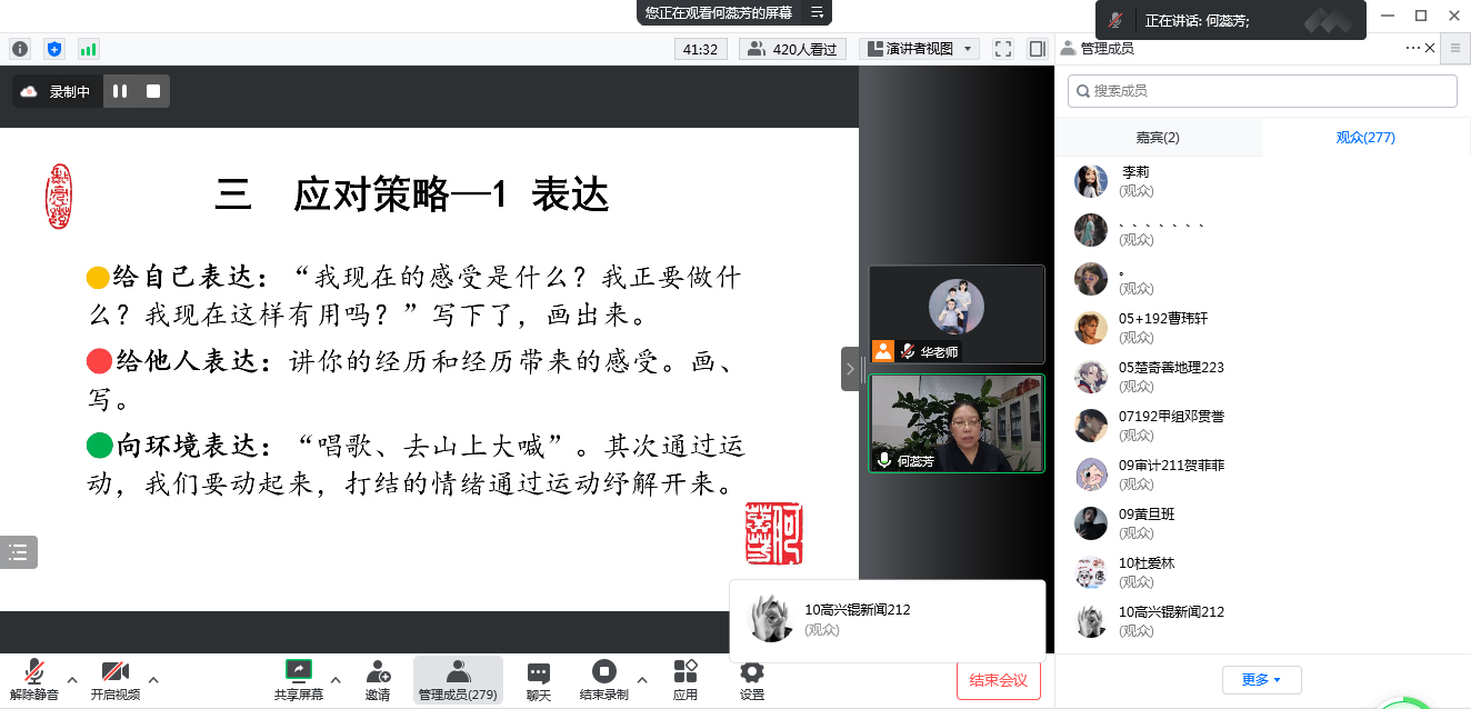 甘肃省第二人民医院副院长何蕊芳为伟德学生作了关于心理维护与压力调试专题讲座。何蕊芳讲解了疫情带来的生理改变和心理反应,指导同学们理性认识新冠疫情,科学、精准做好日常预防控制,并针对大家关心的问题进行了解答。