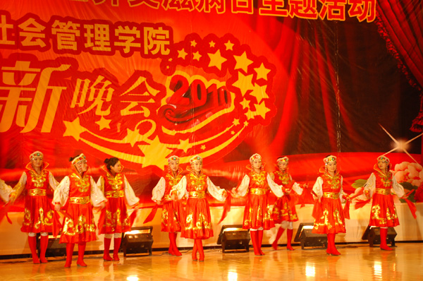 社会管理学院负责人在晚会致词中对2010级新同学提出了希望,希望全体新同学志存高远,刻苦学习,勤奋读书,立志成才,做遵守纪律的典范,以坚忍不拔的毅力、追求卓越的雄心,努力把自己培养成为具有深厚文化底蕴,扎实专业知识,强烈创新意识的国家栋梁和社会精英。晚会随着歌伴舞表演《飘动的红丝带》拉开帷幕,演员们甜甜的笑容,向在场观众诠释着关爱的信息。艾滋病主题小品《新扁鹊与蔡桓公》紧接着出场,演员们倾情的表演让观众深刻领悟到人与人之间相互关爱的高尚情操,演出赢得了现场观众的阵阵掌声。舞蹈《爱的华尔兹》更在寒冷的冬夜里,点燃了希望,传播了爱心。
