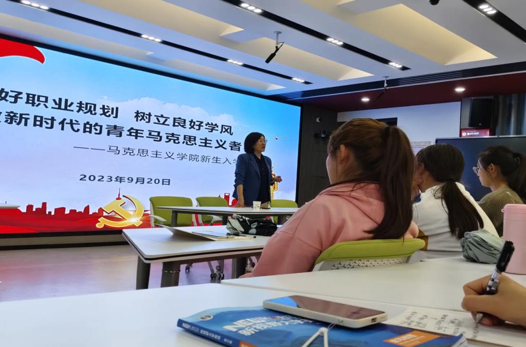 马克思主义学院2023级新生入学典礼上,学院党委书记就正确处理同学关系、在大学四年中提升自己、展现新时代马克思主义者的精神底色对新生进行引导。